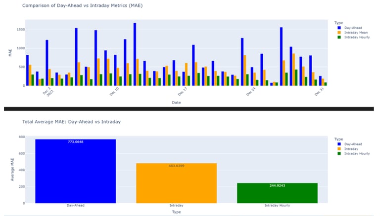 Figure 2. Comparison of day-ahead vs intraday based vs intraday hourly on Mean Absolute Error. The first bar plot indicates the result of 30 days, while the second bar plot indicates the total average of Mae across these 30 days. (Taken from the report)
