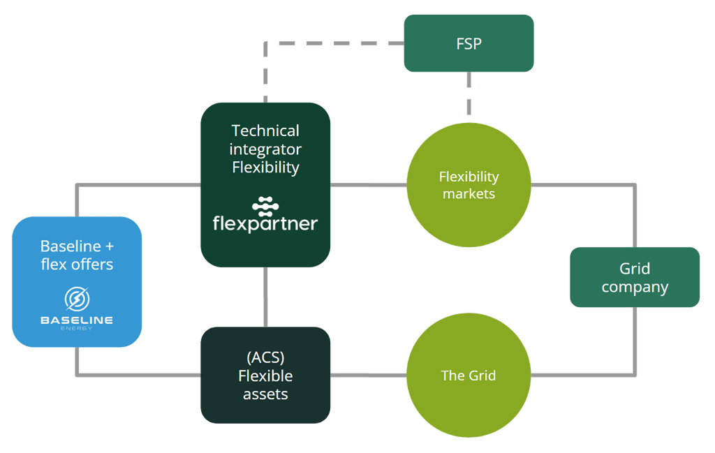 Flexpartner-systemet er integrert med Asset Control System (ACS) i bygget hvor asset er installert. En ACS kan være et Ladesystem for elbiler, et SD-anlegg, et Smart Home-system i private hjem osv. Når fleksibilitet skal leveres gir Flexpartner Systemet setpunkter til ACSen slik at ACS kan redusere eller øke forbruk/produksjon for ressursene.