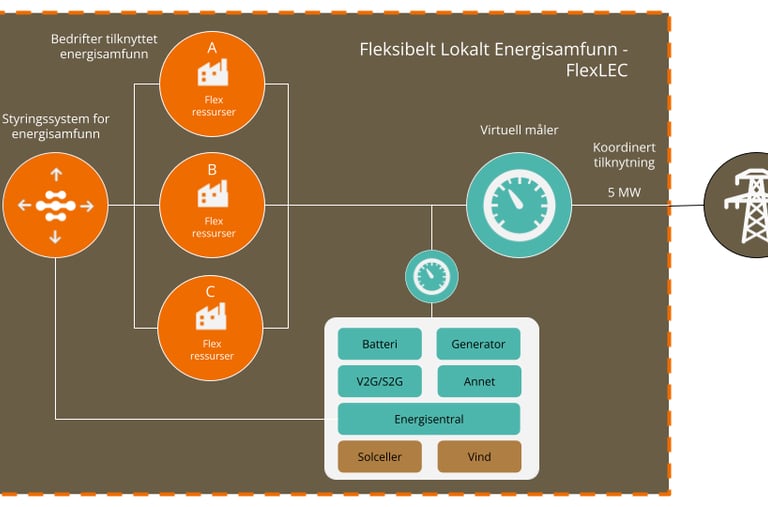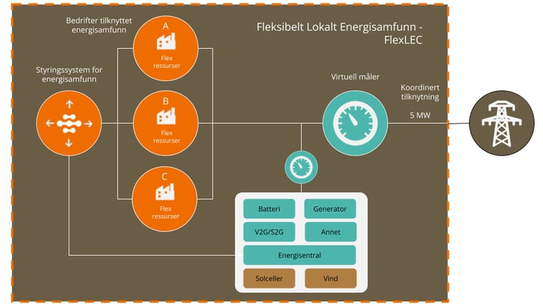 Et FlexLEC-prosjekt er basert på «energideling», et enkelt, men svært effektivt og pålitelig konsept. Det betyr at hvis selskapene i den aktuelle industriparken trenger mer energi og ikke kan motta den fra nettoperatøren av ulike årsaker (flaskehalser i nettet, ineffektiv infrastruktur, kontrakter osv.), kan de dele energien seg imellom.